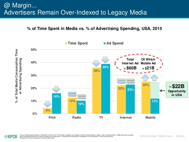 That means, according to Meeker, that companies remain underindexed to mobile, something she expects to eventually correct.