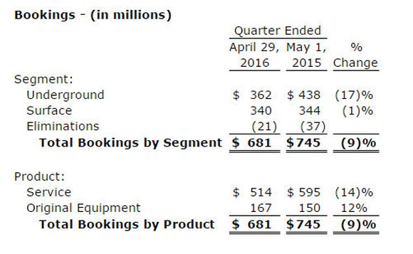 But there's more to get out of Joy's report than just the bottom line results. For example, Joy's sales were down 26% compared to the year ago period, with weakness on both the original equipment and services sides of the business. Caterpillar's top line was off a similar amount, though it has a much more diverse product line up. Still, the top line weakness at both companies is a statement to the weakness in the mining industry. Looking forward, however, bookings for new business were something of a mixed bag for Joy, which might give some hope of a turnaround.