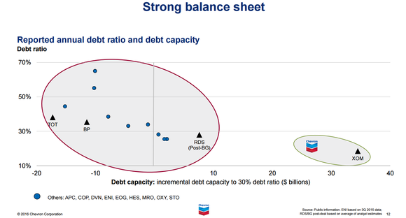 Debt has been one of the saving graces for Chevron and many others during this downturn, and as Chevron has highlighted in some of its recent investor presentations, both it and ExxonMobil hold a huge advantage over many of its peers in terms of balance sheet strength.