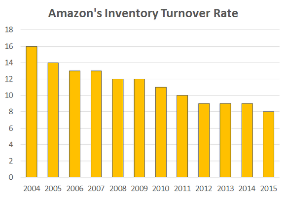 Amazon turned over its inventory 16 times in 2004. That's a quick pace for any retailer. Last year, Amazon's inventory turnover rate was just 8, the result of a decade-long decline.
