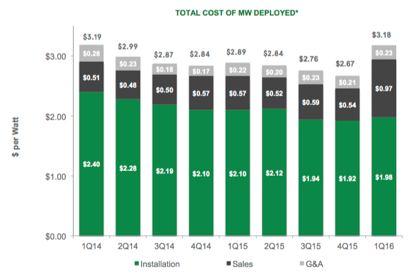 The market is also moving away from SolarCity's preferred business model. The leases and power-purchase agreements that locked customers into solar energy contracts for 20 years were a good way to get cautious customers into solar with no money down while the industry was in its early growth phase, but now, customers want to buy systems with cash or loans -- a method that saves them considerably more money over the long term, and allows them more choice in what they get installed on their roofs. CEO Lyndon Rive admitted that the lack of a loan product in the first quarter cost the company sales, and was one reason it had to lower 2016 guidance. The rising popularity of sales and loans will also make rooftop solar more competitive on a cost basis, which may not be good for SolarCity, and a merger with Tesla doesn't change that.