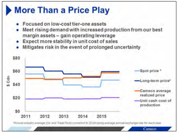 The Cigar Lake investment is actually part of a bigger plan at Cameco. You see the company knows it can't predict the price of uranium, even though it expects better days ahead. So it's working to ensure that it is a low cost producer that can thrive at any price point, refocusing on its lowest cost and most productive assets. In fact, the graph above shows just how well the miner has managed through these tough times, with the purple cost line well below the orange line that represents Cameco's average realized price. More important, it shows visually why, despite the top- and bottom-line hit Cameco has taken from low uranium prices, the company has remained profitable throughout the downturn. The way it goes about creating contracts is a big part of this, as it tries to lock in prices on 40% of its deals and has exposure to market prices with the rest, providing some downside protection while still offering some upside participation.