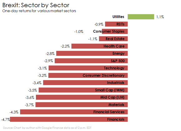 Some industries are holding up better than others. As the chart below shows, returns are varying tremendously by sector. Financials have been hit the hardest. Utilities, however, are actually up by more than a percentage point in afternoon trading.