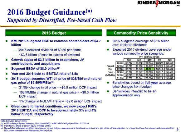 When Kinder Morgan published its budget guidance for 2016, it was based on oil averaging $38 per barrel this year, which was the price at that time. At that oil price, the company expected to produce $4.7 billion of distributable cash flow, which would enable it to cover its dividend with nearly $3.6 billion to spare. That excess cash flow would be reinvested into its growth capital projects, allowing the company to avoid accessing the capital markets during the energy market downturn.