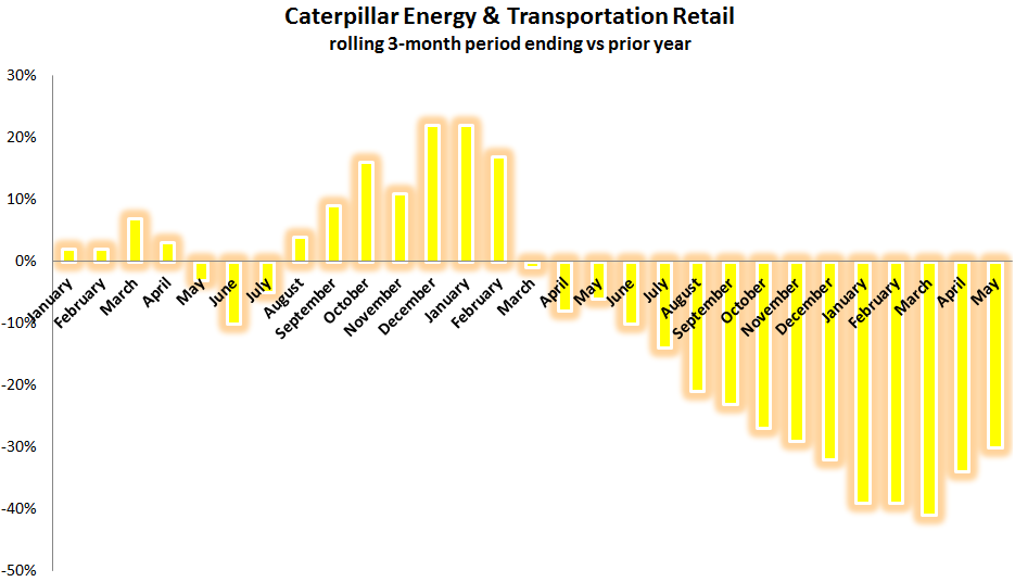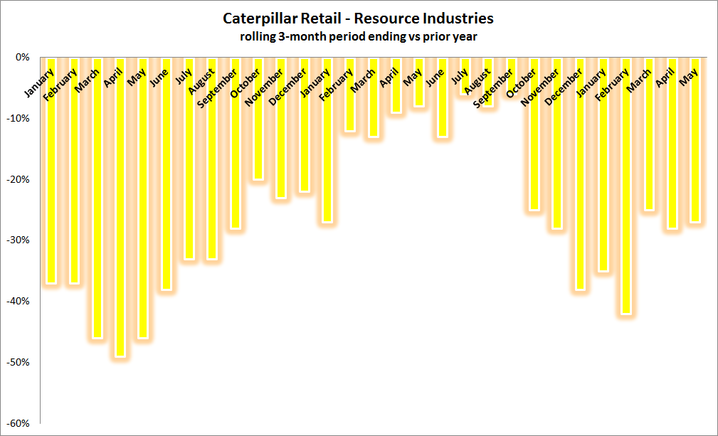 Let's look at Caterpillar's resource industries segment, which has been devastated globally by weakness in commodity prices and thus less demand for mining equipment. Breaking down its retail statistics per region, Asia-Pacific drove the global loss, with its retail sales declining 48% last month -- which is reported as a three-month rolling period ended as of the month indicated, compared to the prior year. While that was the worst decline in the resource industries, its EAME, Latin America, and North America regions posted declines of at least 20%: down 22%, 23%, and 20%, respectively.