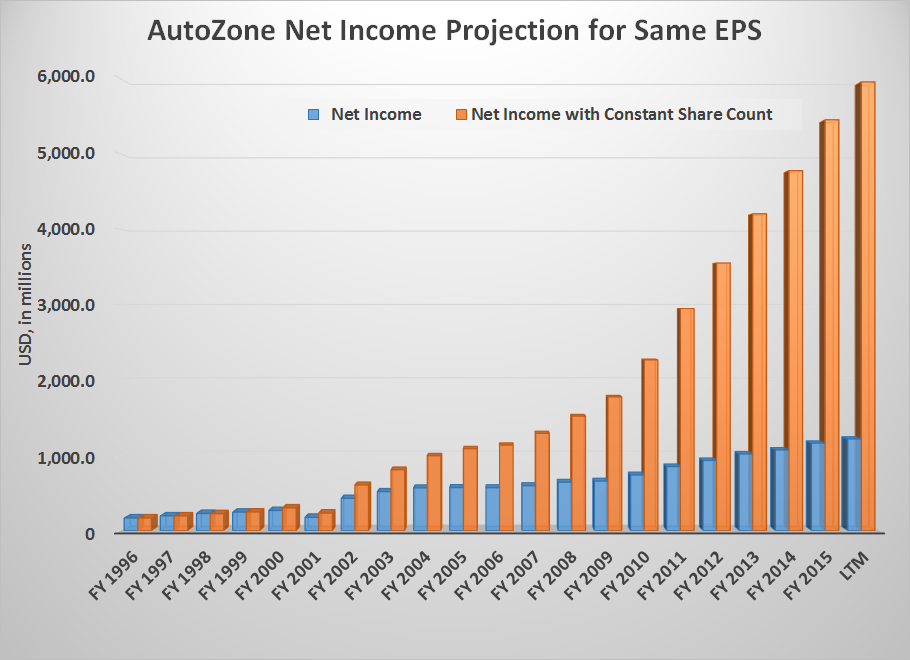 Instead of simply leaving it at that to show the effectiveness of share buybacks, let's do something a little different. If AutoZone hadn't repurchased all those shares over that time frame, could it have achieved the same level of returns? Some Wall Street gurus will argue that reinvesting that money in the business will generate superior returns. If we look at what AutoZone would have needed to do to achieve similar results, though, that theory looks a little far-fetched.