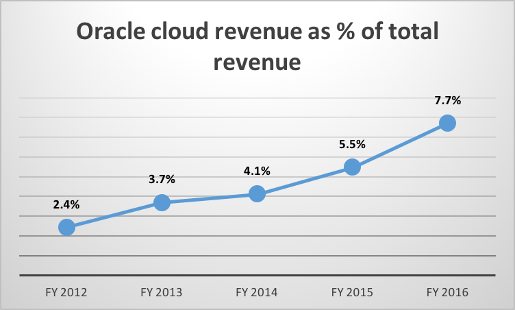 Despite the incredible growth rates coming from cloud, Saas and PaaS revenues are still a small portion of Oracle's overall business. Oracle's cloud revenue in its latest fiscal year is only 7.7% of its total sales. Therefore, increasing cloud revenue wasn't strong enough to offset the loss of business in its more profitable on-premise business. Overall revenue in 2016 decreased 3% from the prior year. Nevertheless, the trend of growing its cloud business relative to total revenue is heading in the right direction.