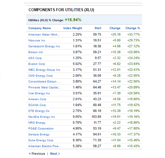 And drilling down is easy with the tracker. We can click on the sectors in the charts to get a list of the top-performing S&P stocks in each area. Curious to know which companies are driving the stellar performance of utilities year to date? Here's the list: