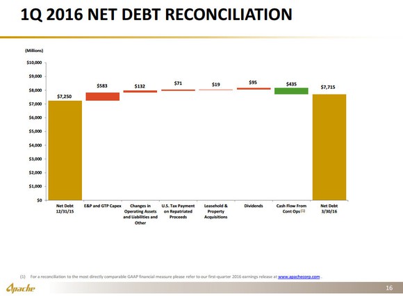 Heading into 2016, Apache planned to match capital expenditure with cash flow at a $35 oil price to avoid adding any more debt to its balance sheet. That was a common target across the sector, with Continental Resources (CLR +0.00%), for example, aiming to do so under the assumption that oil would average $37 per barrel. The first quarter, however, was a tough one for the oil sector after crude prices plunged into the $20s. Those low prices ate into the cash flow that Apache had expected to earn, which caused it to outspend cash flow on capex and other expenditures. This resulted in the company's debt level rising: