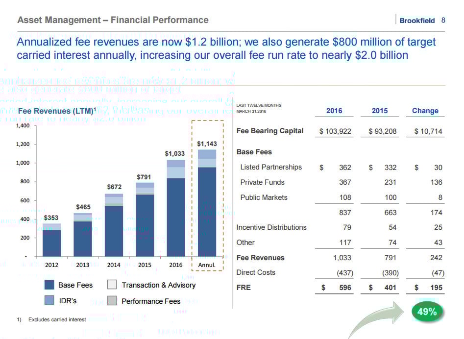 By going this route, Brookfield now captures fees from the nearly $104 billion in fee bearing capital it has under management via its four publicly traded entities and its private equity funds. This capital is expected to generate nearly $1.2 billion in annualized fee revenue for Brookfield, which is up substantially over the past five years: