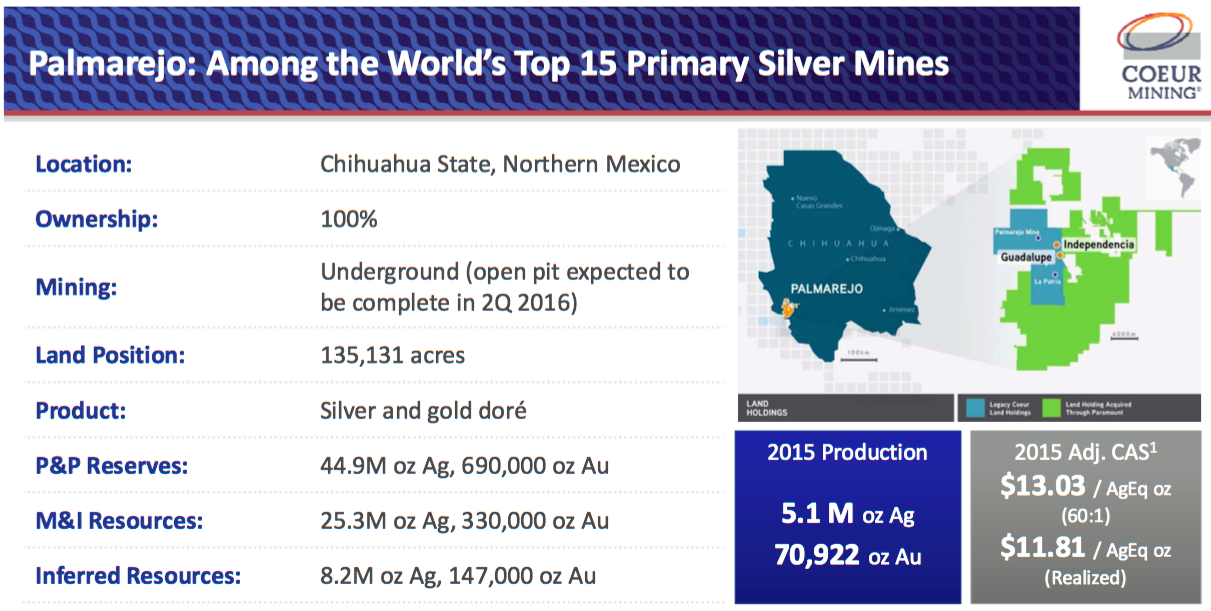 Coeur Mining's Palmarejo mine in Durango, Mexico, still reigns supreme. Image source: Coeur Mining analyst presentation, June 2016.