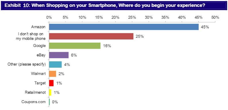 A June 2015 survey by Mizuho Securities showed that when it comes to shopping on a smartphone, nearly half (45%) of smartphone users start with Amazon. That compared with 16% for Google, 6% for eBay, and only 2% and 1% for Wal-Mart and Target, respectively.
