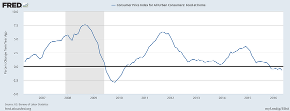 Price change from prior-year period for groceries. Image source: Federal Reserve Economic Data.