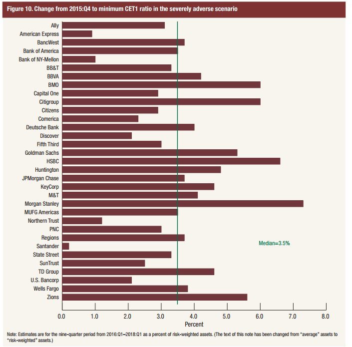 Under the severely adverse scenario, American Express's tier 1 capital ratio would fall by less than one percentage point, substantially better than other credit card companies, and better than the median financial company, which would see its tier 1 capital ratio fall by 3.5 percentage points.