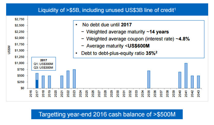 The picture, however, has started to look a lot brighter over the past few months. For example, long-term debt at the end of the first quarter stood at around 34.5% of the capital structure, down from the end of 2015. And the actual dollar value of the company's debt is down around 10% because of changes in the value of the Canadian dollar. Perhaps more important, however, the costs for the Fort Hills investment are nearing an end.