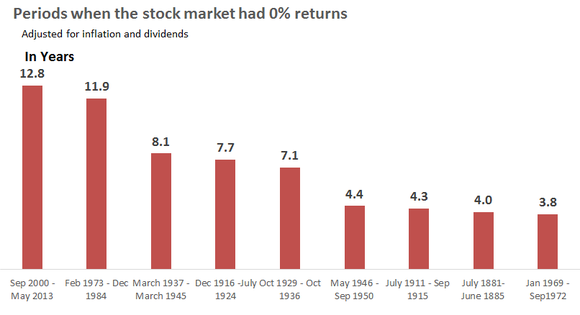 The 13 years ending in May 2013 was the longest such stretch. If you survived this period with your head on straight, congratulations — it was, statistically, the most frustrating period in market history. Even during the Great Depression, when the market was down almost 90% at one point, we saw new highs after about seven years (adjusted for dividends and inflation).