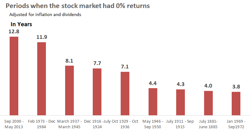 The 13 years ending in May 2013 was the longest such stretch. If you survived this period with your head on straight, congratulations — it was, statistically, the most frustrating period in market history. Even during the Great Depression, when the market was down almost 90% at one point, we saw new highs after about seven years (adjusted for dividends and inflation).