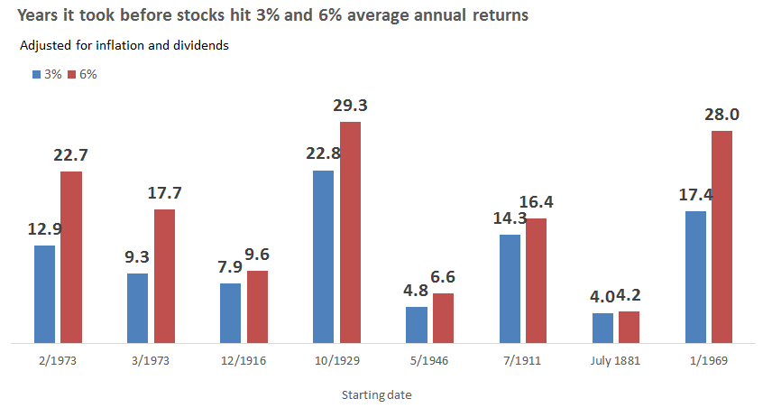 And that's just periods of 0% returns. No one gets excited about running in place. How long did it take from these starting points before you earned a decent annual return? Quite a bit longer: