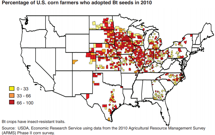 That created a major market for Bt crops, which have been quickly adopted by farmers in the United States and have significantly reduced the use of chemical insecticides. In 2015 nearly 81% of corn acres and 84% of cotton acres in the United States grew crops containing a Bt trait, according to the U.S. Department of Agriculture. As a result, in 2010 the percentage of corn acres using insecticides fell to 9%, while the average acre of corn used just 0.02 pounds of insecticides compared to 0.21 pounds per acre in 1995.
