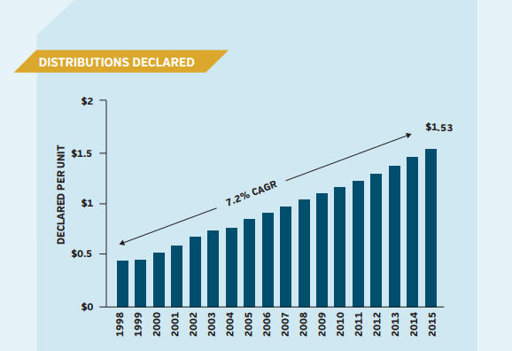 As long as we continue to use oil and natural gas, Enterprise's business has material value. That helps explain why its distributable cash flow (the money it has to pay distributions) has gone up for three years despite the oil rout that started in mid-2014. Distributable cash flow was up again, year over year, in the first quarter. Moreover, Enterprise covered its $0.39 a unit quarterly distribution by 1.28 times in the first quarter, leaving plenty of leeway for future hikes. The first quarter represented the 47th consecutive quarterly distribution increase, by the way.