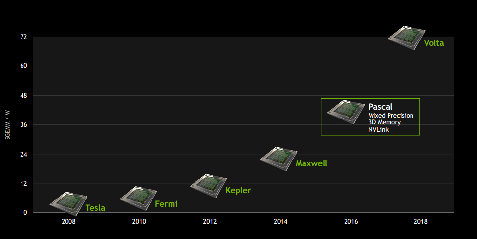 NVIDIA expects a big boost in power efficiency in going from Pascal to Volta. Image source: NVIDIA.