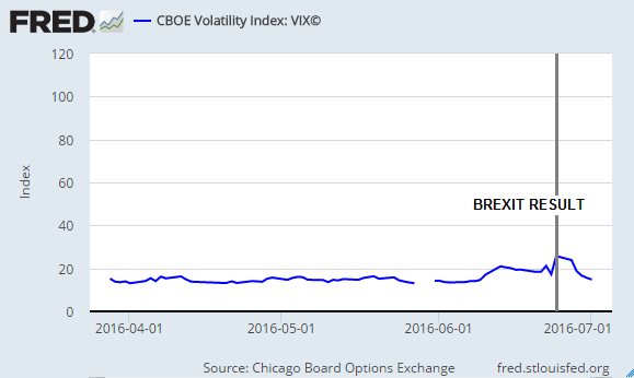 In this case, you can spot an increase in the VIX on the day markets first digested the referendum result (the point of intersection with the vertical grey line), but it's nothing compared to the post-Lehman spikes. Furthermore, the index went on to fall during the next four sessions; its current value is significantly below its historical average.