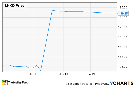 There's no mystery as to why LinkedIn (LNKD +0.00%) shares spiked in June. The company agreed to a deal in which Microsoft (MSFT +1.78%) would acquire it for $26.2 billion, or $196 per share, a roughly 50% premium on the company's stock price before the sale.