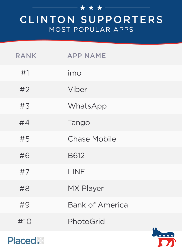 "The top four apps for Clinton supporter are messaging apps: imo, Viber, WhatsApp, Tango," he wrote. "Trump [supporters'] top apps could be considered more practical with Walmart, Audible, Slacker Radio, and Amazon Music and Kindle."