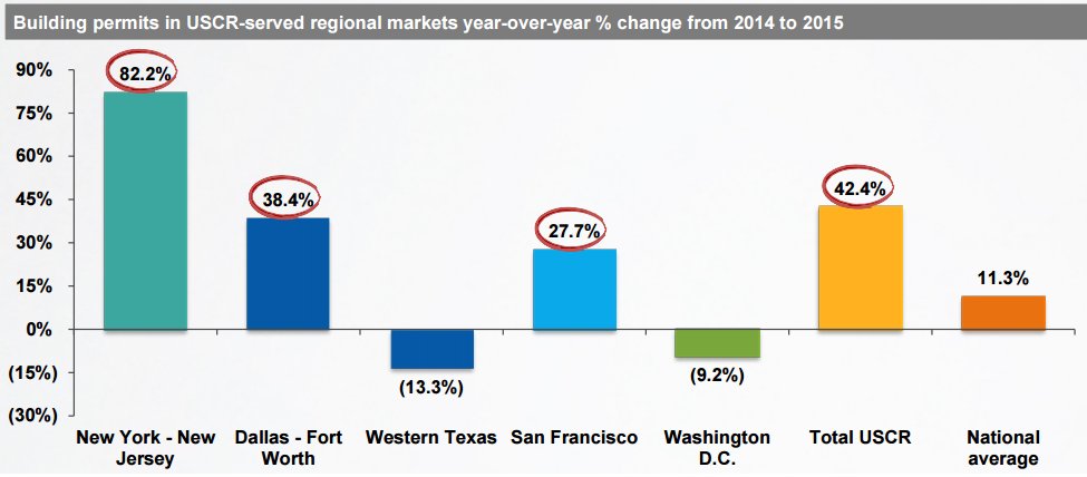 Last but not least, U.S. Concrete's markets have witnessed a surge in building permits, which is great news for a maker of concrete. Take particular notice of the total compared to the national average.