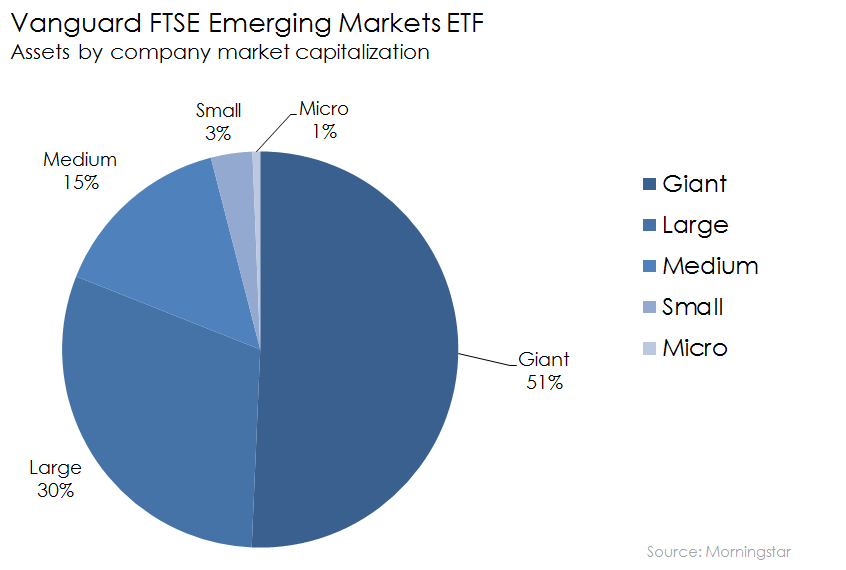 This is one of the disadvantages that plague index ETFs compared to actively managed funds, but the trade-off is the substantially lower price. (A competing index tracker, the iShares MSCI Emerging Market ETF (EEM +0.06%), is more geographically diverse as its underlying index also includes South Korean stocks, but it is also concentrated in China, putting more than a quarter of its assets in Chinese equities. Country concentration is not a Vanguard-specific issue.)