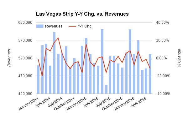 Now, it's true May 2015 was a unique month for Las Vegas: It generated over $1 billion in gaming revenue for the month, with the Strip enjoying one of its best months, raking in over $601 million in revenue, a 15% year-over-year gain. It's understandable the 2015 comparisons might not be as strong, but when you look back further, it's clear there is still weakness.