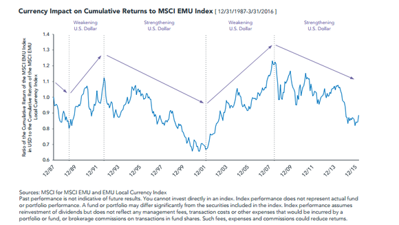The chart below shows just how devastating currency fluctuations can be to performance. Since the 2008 financial crisis, the U.S. dollar has generally strengthened against the euro. Americans who bought European stocks would have a significant portion of their would-be gains erased by the U.S. dollar's strength during the period.