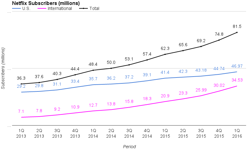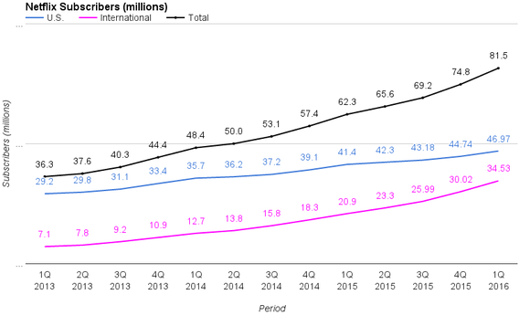 Netflix is proving to be enormously successful on a global scale: The company ended the first quarter of 2016 with 81.5 million total subscribers. Just three years ago, Netflix had only 36.3 million subscribers globally, so it has more than doubled its subscriber base since then.