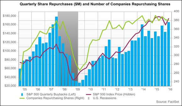 This investor disagrees -- there is something to be concerned about. The fact is, many companies lack all discipline when it comes to share buybacks. The following graph from data provider FactSet Research Systems, Inc., offers stark evidence of that observation. The graph displays aggregate quarterly buybacks for the S&P 500 (blue columns) and the value of the S&P 500 index (purple line):