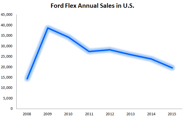 Furthermore, while sales of the Flex are up 11% during 2016, it has sold fewer than 12,000 units this year through June. Among Ford-brand SUVs, the Flex ranks last in year-to-date sales, even trailing the specialty Police Interceptor Utility -- yeah, exactly. It's not just a bad year, either: Take a look at the Flex's not-so-inspiring sales history.