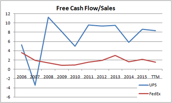 The best way to look at the matter is to measure long-term free cash flow (FCF) conversion. The following chart shows the two companies' FCF from sales in the past decade. UPS's conversion remains constantly higher than FedEx's, although both companies' rates have dipped in recent years: