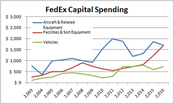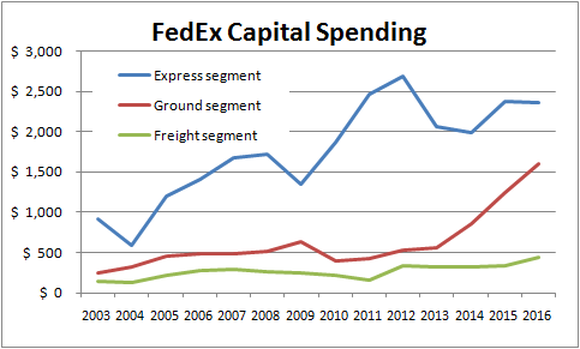 With regard to FedEx, a breakout of its capital-spending plans shows how capital expenditures have increased in its ground segment in recent years. Excluding any TNT-related activities, FedEx plans to increase capital expenditures to $5 billion in its fiscal 2017, from $4.8 billion in fiscal 2016, with $2 billion planned for ground.