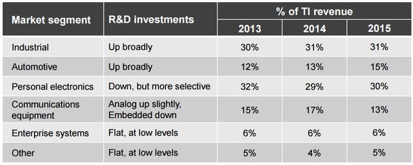 Last quarter, sales of analog chips fell 8% annually to $1.88 billion, but sales of embedded chips rose 8% to $729 million. Revenue from its "other" category, which includes calculators, other devices, and royalties, declined 10% to $400 million. Total sales fell 5% to $3 billion. TI only breaks down its revenue by industry at the end of each fiscal year: