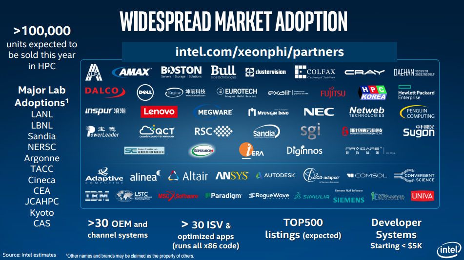 When Intel formally launched the Knights Landing-based Xeon Phi processors, the company said in a presentation that these new chips would see "widespread market adoptions." In particular, Intel says that it expects to sell over 100,000 Knights Landing units this year into the high performance computing market and even provided long lists of system builder partners and research laboratories that will adopt the products.