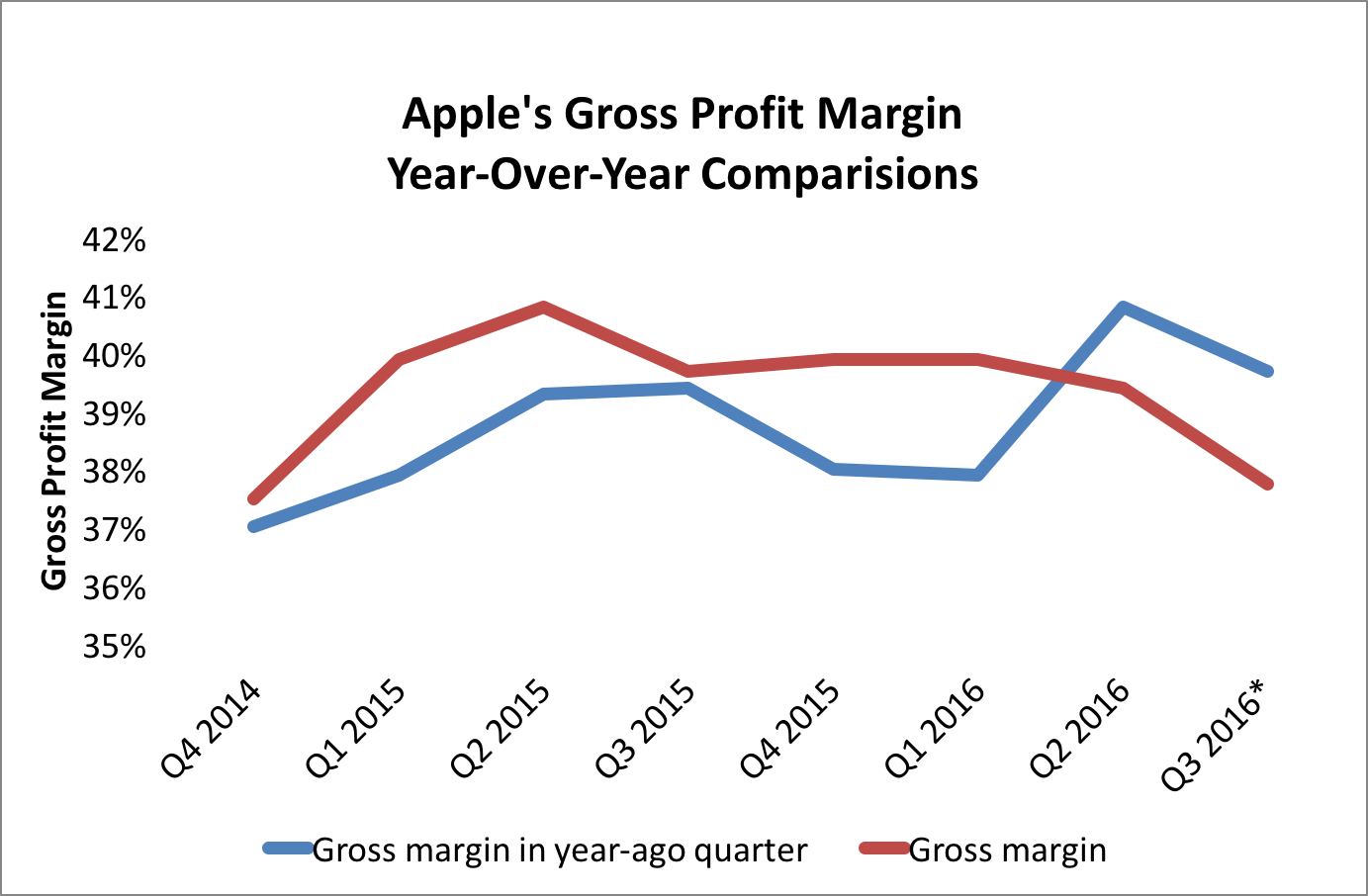 For Apple's third fiscal quarter of 2016, the continued trend of declining iPhone sales is expected to negatively impact the company's gross profit margin again. For Q3, management said it expects its gross profit margin to be between 37.5% and 38% -- down from 39.7% in the year-ago quarter.