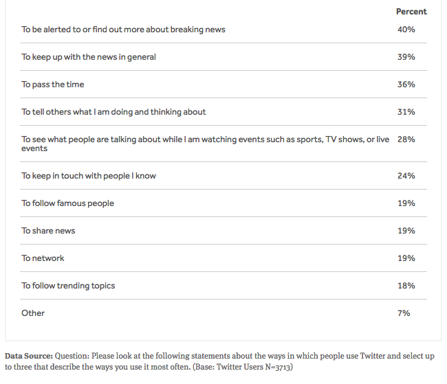 Twitter, on the other hand, was conceived as a quasi-short text status update service, though it quickly exploded in popularity among those seeking an audience: celebrities, athletes, journalists, politicians, artists, and the like. Here are the results of a 2015 survey of Twitter usage from The American Press Institute: