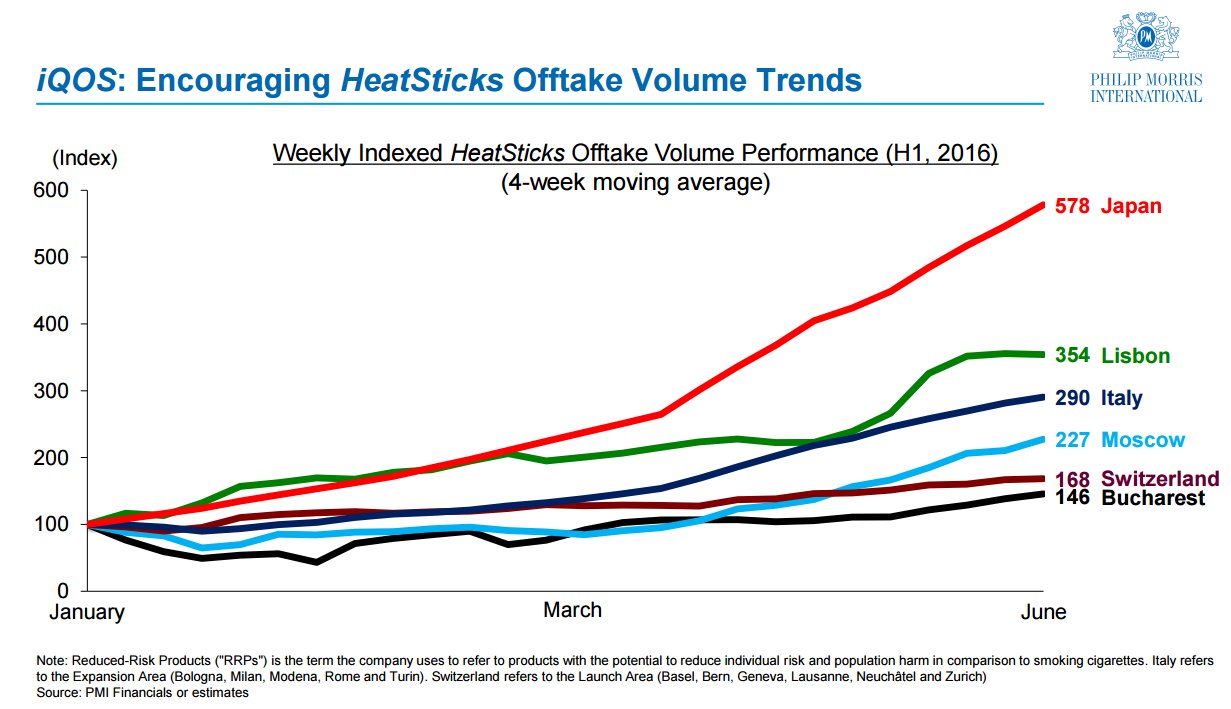 The iQOS was launched nationwide in Japan in mid-April and has already claimed a 2.7% share of the country's cigarette market. PMI claims that 70% of iQOS purchasers in Japan have been either "fully or predominantly" converted to it. The device is cannibalizing about 35% of PMI's own cigarette portfolio in Japan, but the company notes that many smokers are "up-trading" to HeatSticks from cheaper brands, thus boosting its overall revenue. PMI has already launched iQOS in 10 markets. While Japan has been the best-performing market so far, other launch markets have posted similar growth.