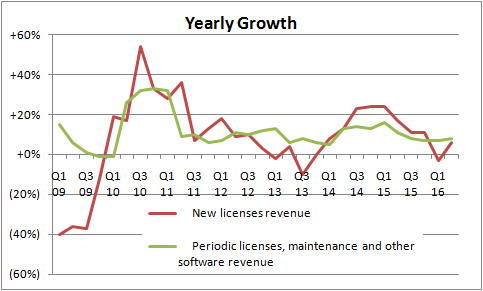 However, readers should note that in the fourth-quarter 2015 results presentation, delivered in February, de Tersant had predicted "our financial objectives for 2016, with double-digits organic new licenses revenue growth for a third year in a row."