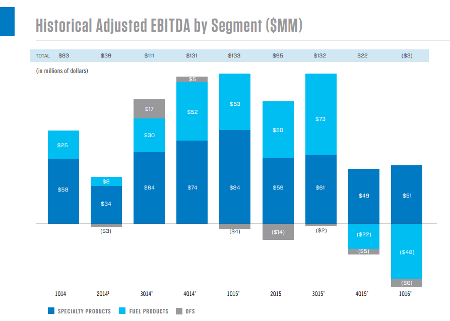 Another thing that the company could consider is winding down its exposure to fuels by divesting of some refineries that do not have significant specialty product manufacturing ability. Management believes that it can achieve better results from this segment by tweaking the facilities to use more disadvantaged crudes such as heavy Canadian oil, but if that is the case we will likely have to wait several quarters before we see any effects of this.