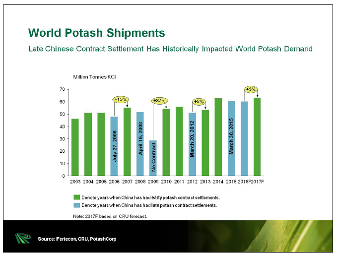 It noted that over the past decade and a half, there have been a handful of times when China has delayed signing a contract, or even didn't sign one at all (during the depths of the Great Recession). But when that happened, the following year demand tended to increase and the industry saw prices rise. PotashCorp believes that situation will run true to form next year as the delayed contract sets up "the potential for a strong demand recovery in the coming year."