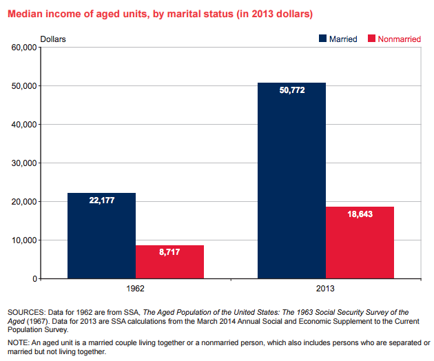 Luckily for us, between 1962 and 2013, both married and non-married retired persons have seen their income increase markedly.