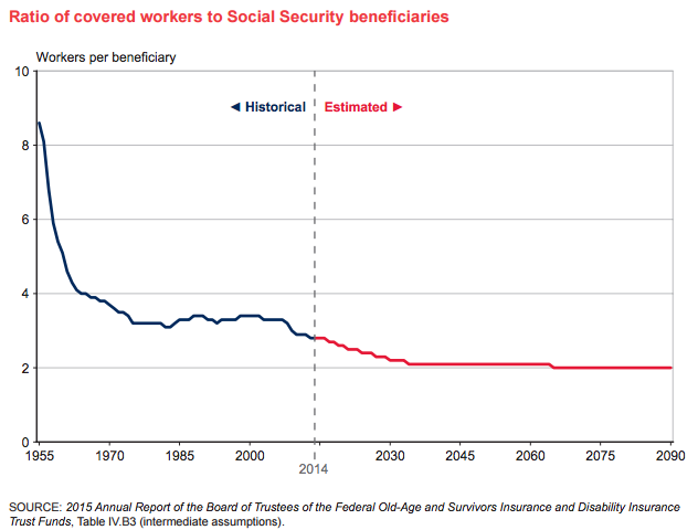 Even as recently as 1960, there were four workers contributing FICA taxes for every one beneficiary. Today, that ratio stands at 2.5, and with baby boomers about to start retiring in droves, it is expected to drop to just over 2.0 by 2030.