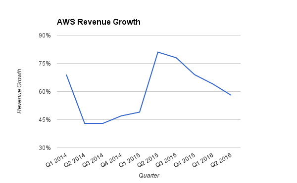 Unfortunately, Microsoft hasn't reported Azure revenue growth on a regular basis, so it's impossible to see the year-over-year growth trends. However, Amazon saw a significant acceleration in revenue growth for AWS a year after it made major price cuts, which can be seen starting in the second quarter of 2015.