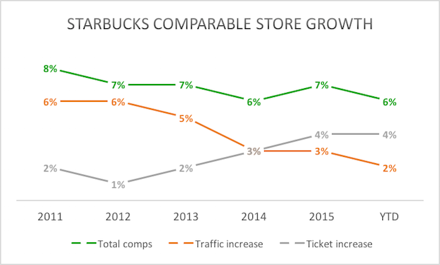 Growth in the former is driven by two factors: an increase in average ticket price and traffic growth. Increasing average tickets are a good sign of pricing power and the company's ability to upsell customers, while growing foot traffic is an equally (if not more) important metric. A rise in traffic can reflect the popularity of the brand, customer loyalty, and the ability to obtain new customers. A combination of the two metrics drives the total comps number, and Starbucks has more than impressed here.