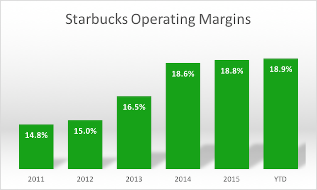As far as restaurant-level efficiency goes, the company just released record numbers. GAAP operating margins came in at 19.5%, an increase of 30 basis points over the prior-year period. Year-to-date, Starbucks is now producing operating margins of 18.9%, a significant improvement over the past five-plus years. As the coffee giant grows, it has been able to improve its operational efficiency and leverage its costs to produce consistently better results.